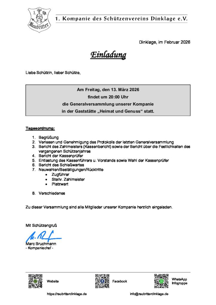 Alle Mitglieder der 1. Kompanie sind herzlich zur diesjährigen Generalversammlung am 13. März um 20:00 Uhr auf dem Saal der Gaststätte Heimat und Genuss eingeladen.